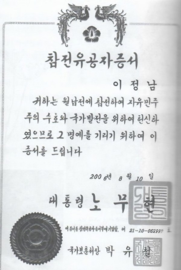 2. 참전유공자증서=>월남에서 살아 돌아온 장병